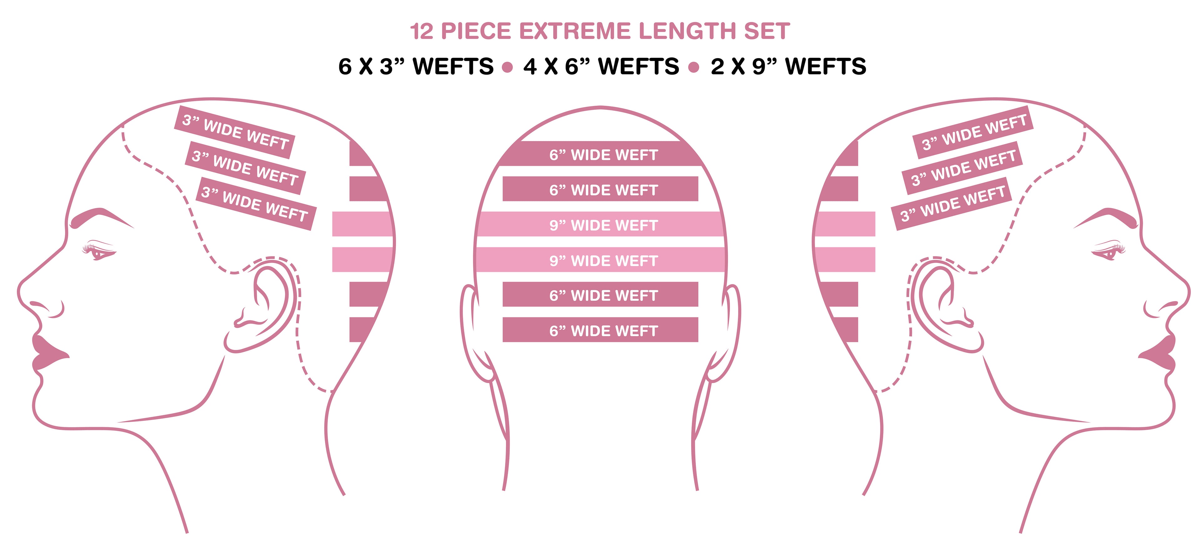 For quick and easy application of your 12-piece Habit Hair X Habit Hair X Extreme Length Clip In Set, simply follow the placement diagram above.